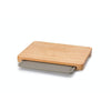 The shape of this cutting board allows for the ingredients, once cut, to be pushed on a plate placed under the side handles. It can also be used as a service platter for sushi, cheeses and cold cuts.